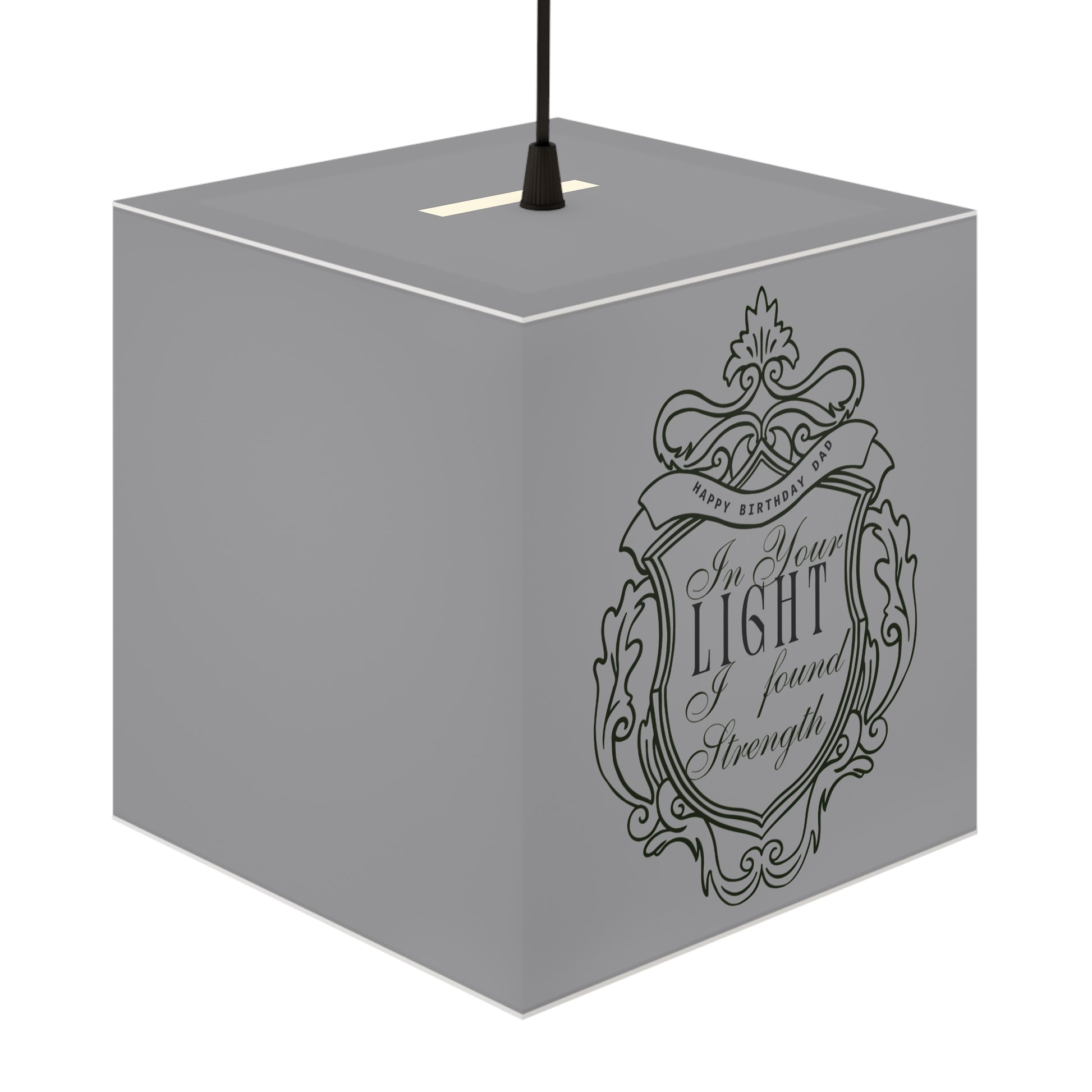 A unique Birthday Gift for Dad, this Light Cube Lamp features a design that says 'In your light, I found my strength.' With vibrant colors, lightweight material, and relaxing ambient lighting, this lamp is perfect for creating a cozy atmosphere in any space. Not suitable for children, this lamp comes in two sizes and includes both a standard cord and a pendant cord for versatile use. Made in Latvia from globally sourced parts.