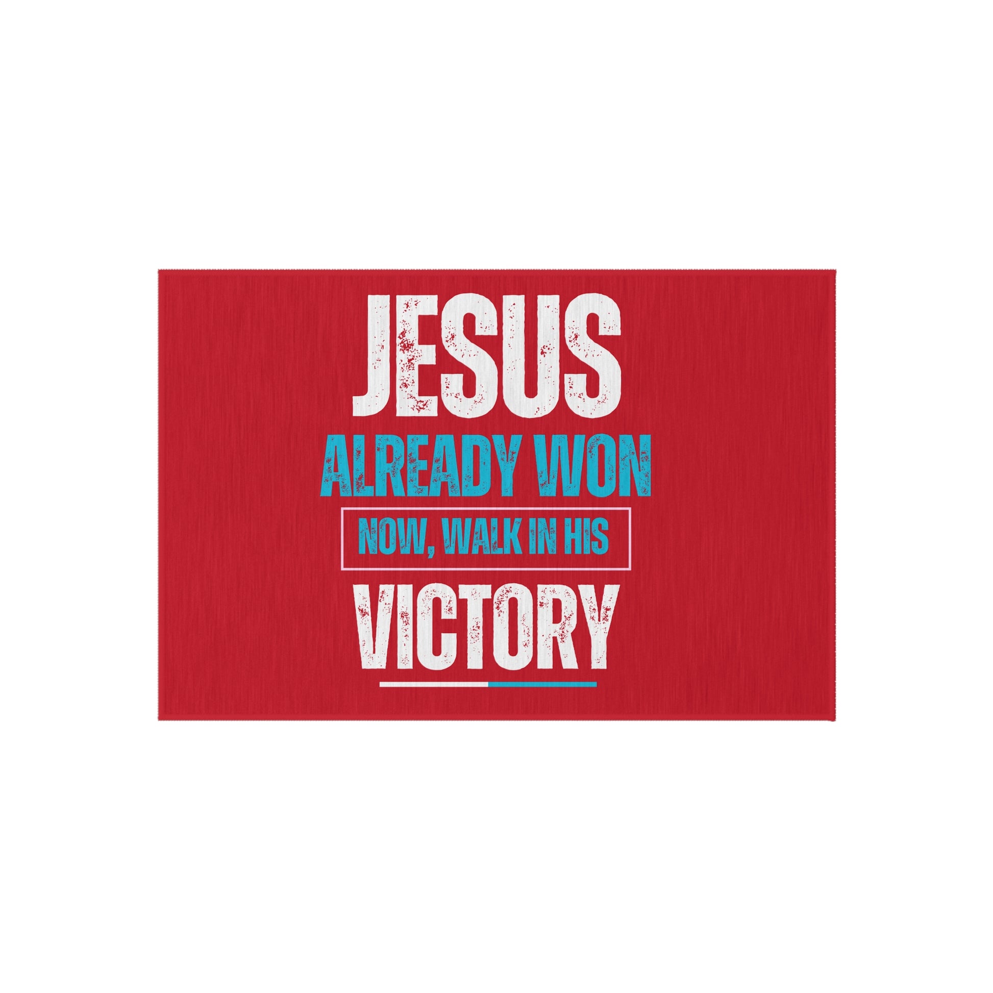 Jesus Already Won, Now Walk in His Victory Rug - Transform your outdoor space with this stunning Outdoor Rug. Designed to bring warmth and style to patios, porches, or gardens, it offers a cheerful and inviting atmosphere. Its vibrant colors pop against the backdrop of nature, making it a perfect centerpiece for any gathering. Ideal for families, entertainers, or anyone looking to enhance their outdoor decor, this rug adds a touch of personality to your outdoor adventures. It’s an excellent choice for summer barbecues, garden parties, or simply relaxing on a sunny day. Celebrate the joys of outdoor living with this stylish and functional addition that’s great for everyday use, special occasions, or casual moments with friends and family.