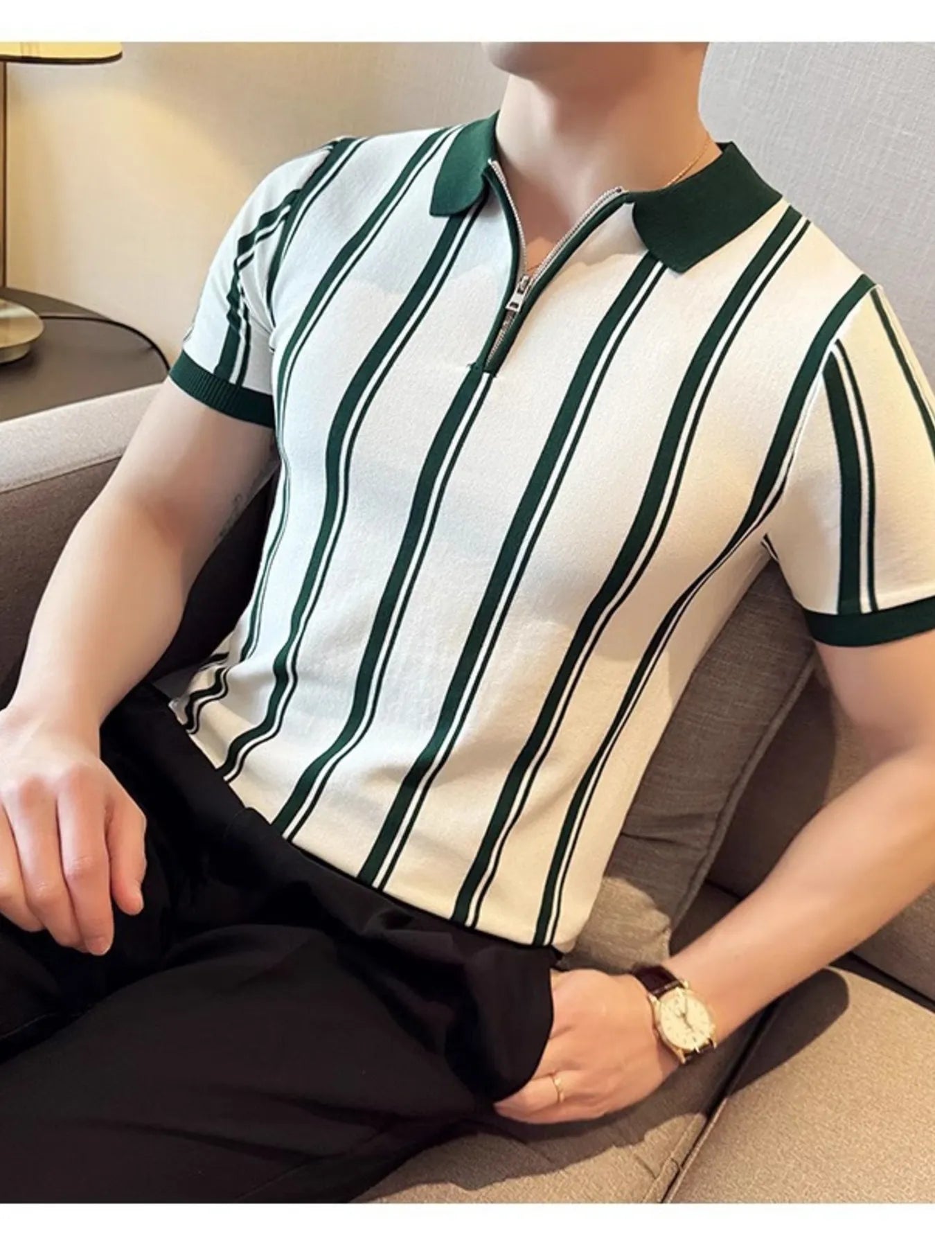 Men's Full Size Classic Striped Zip Collar Polo Shirt Plus Size - Men's Polo Shirt