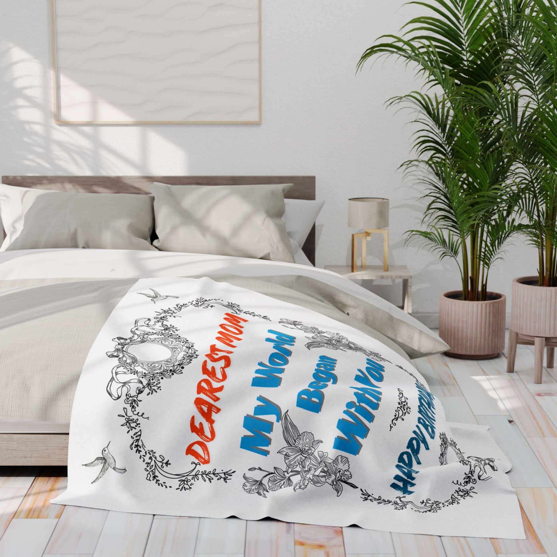 A heartfelt Mom's Birthday Gift Fleece Blanket featuring the message 'Dearest Mom, My World Began With You'. This thick and soft blanket is perfect for cozy evenings and special moments with loved ones. Ideal for adult recipients, this blanket is a thoughtful gift for Mother's Day, birthdays, or just to show appreciation.